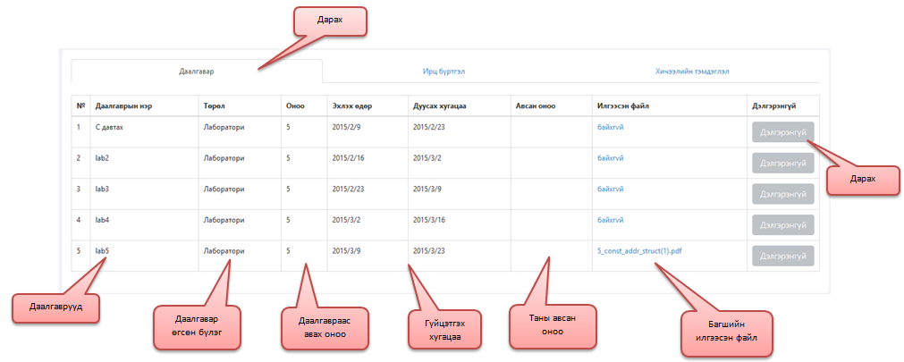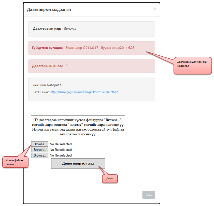 Мөн тухайн даалгаврын харгалзах Дэлгэрэнгүй товчин дээр дарснаар даалгаврын дэлгэрэнгүй мэдээллийг харах боломжтой. Мөн тухайн даалгавраар дамжуулж багш оюутнаас файл хүлээж авах бол оюутан та энэ хэсэгт өөрийн файлыг илгээнэ.